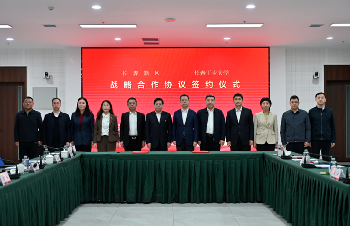 在双方领导共同见证下,副校长赵洲洋与长春新区管委会副主任胡南分别代表校地双方签署战略合作协议。