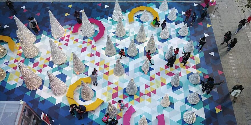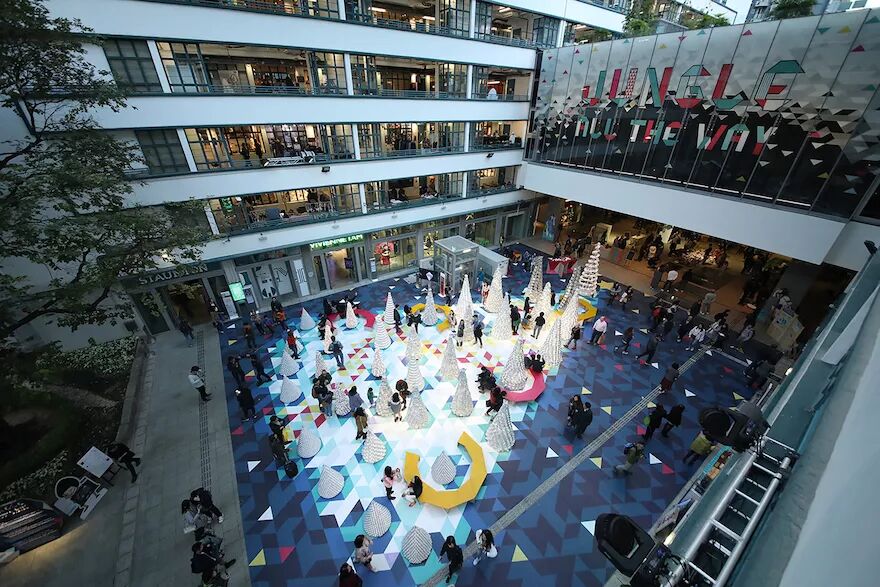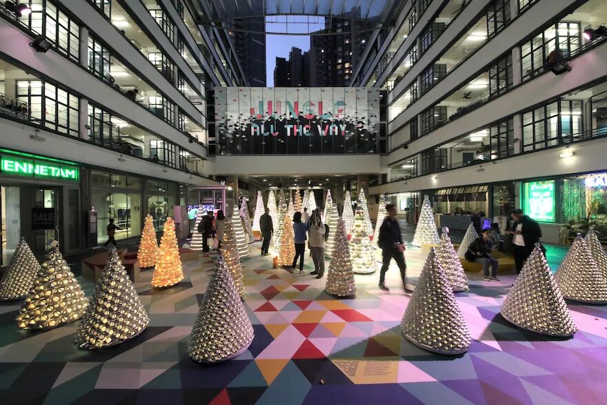 2017年圣诞节,PMQ元创方与AaaM建筑设计工作室合作准备了一份既有节日气氛又具设计及环保理念的圣诞礼物,用过万个回收纸包饮品盒,花上心思与时间,折出36棵‘纸包’圣诞树,以JUNGLE THE WAY,迎‘折’圣诞节。