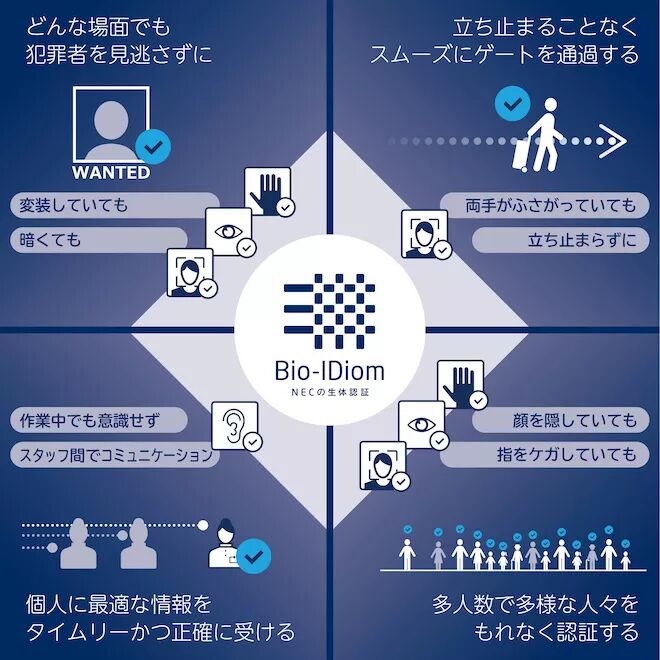 Bie-idiom是使用面部认证、指纹认证等世界顶级的“生物认证技术”,安全、安心的公平服务的商品。从警察和政府的出入境管理·国民ID到娱乐领域,约70个国家有700个以上的导入实绩。机场的出入境审查和在音乐会会场的面部认证系统缩短了等待时间。街上的面部认证系统是检测要注意的人物,并安排警备。为防止犯罪于未然做出贡献。