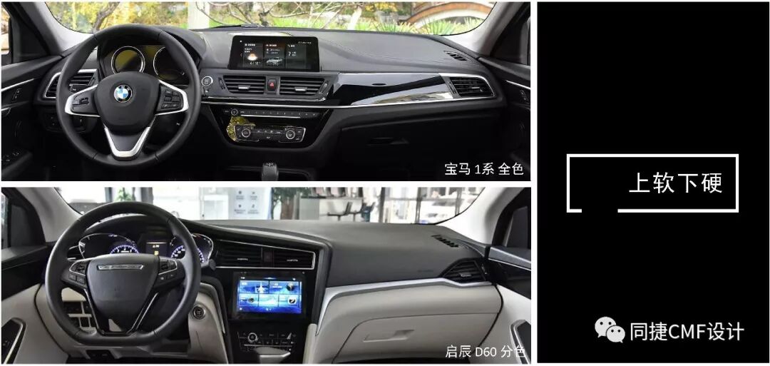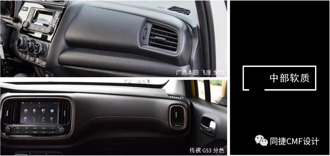 在软硬的分布上——有上软下硬和中部软质两种形式,配合全色与分色的不同使用,表现出内饰不同的风格。