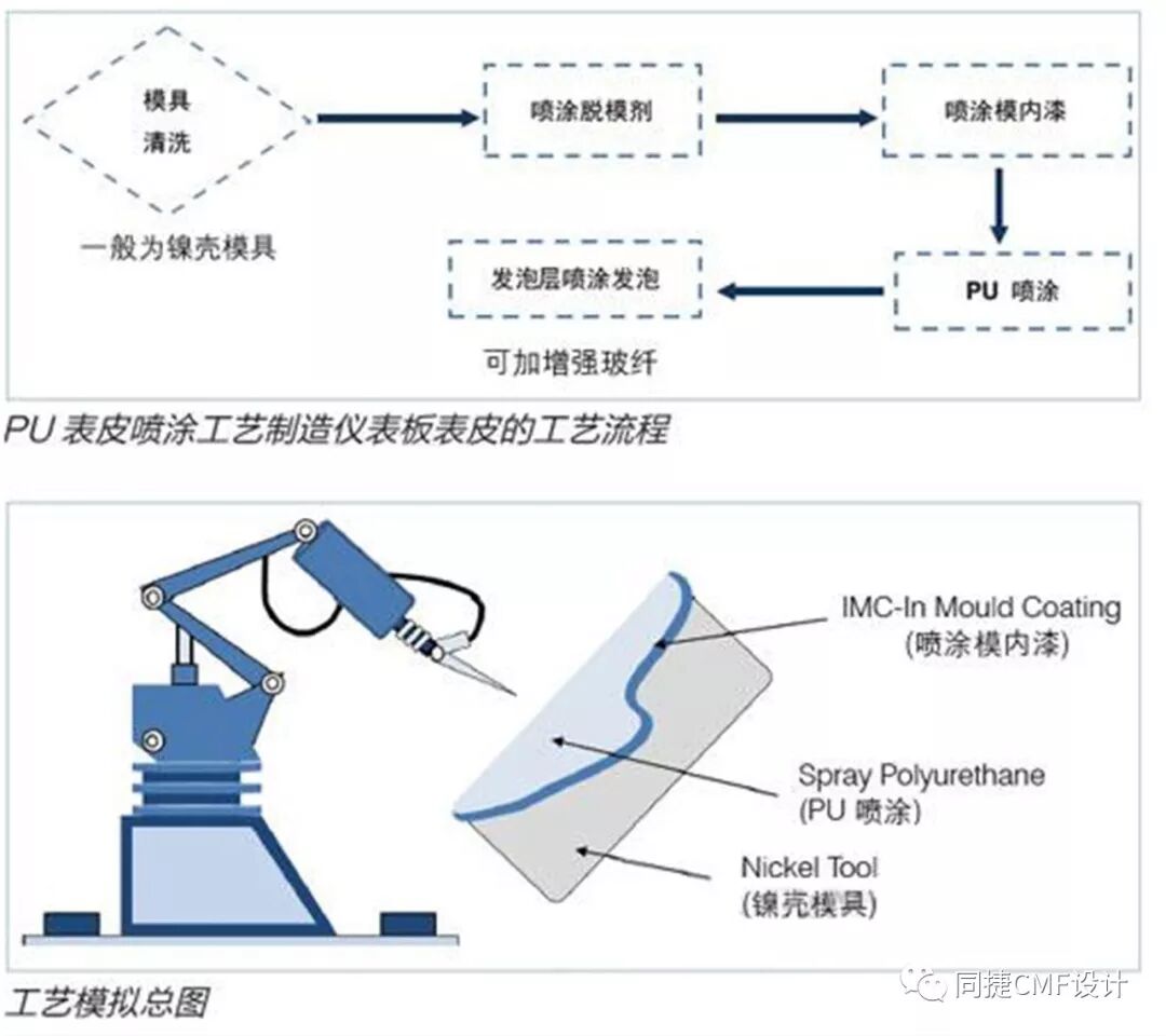 将两组分的聚氨酯原料在经过计量设备精确计量后增压至高压状态,再经高压混合反应,然后喷涂到镍壳模具上,聚氨酯附着在镍壳上成为一张表皮。