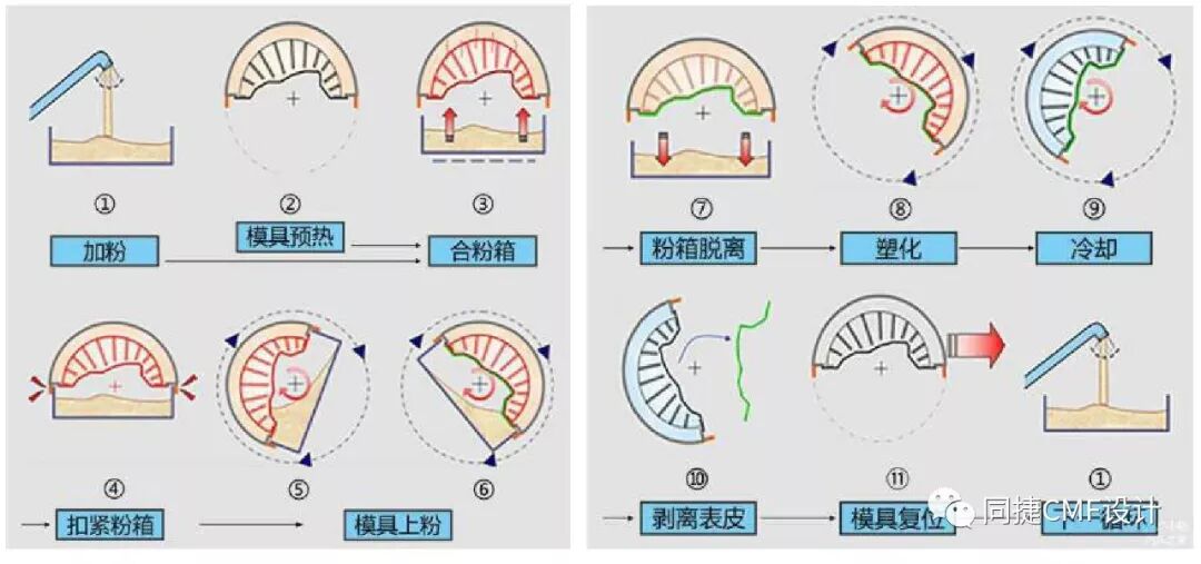 将糊塑料(塑性溶胶)倾倒入预先加热至一定温度的带有表面花纹的镍壳模具中,接近模腔内壁的糊塑料即会因受热而胶凝,然后将没有胶凝的糊塑料倒出,并将附在模腔内壁上的糊塑料进行热处理(烘熔)再经冷却即可从模具中取得空心制品。