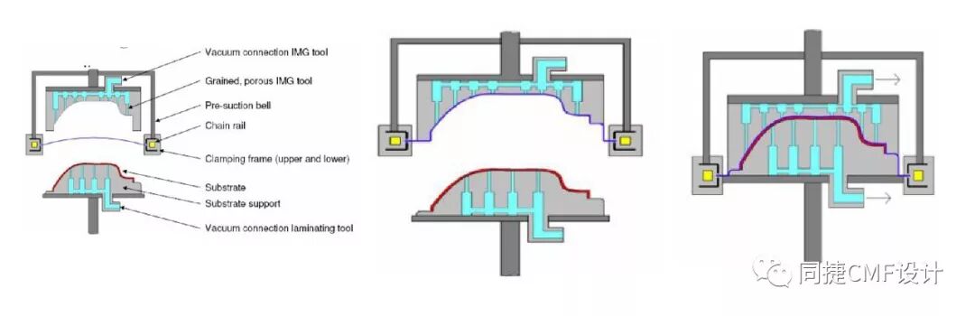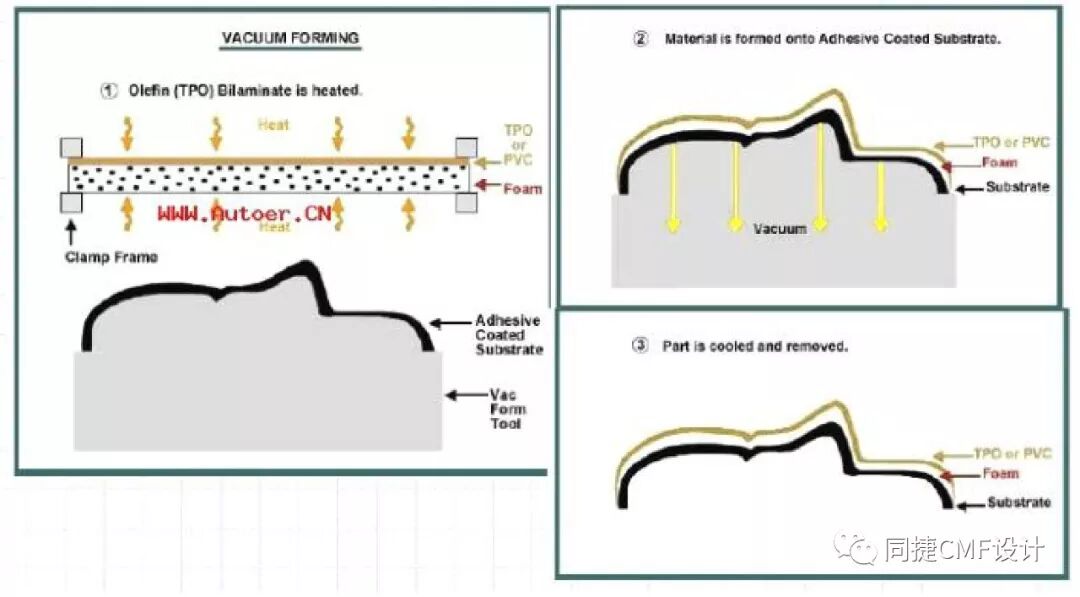 将表皮片材加持固定在真空成型模板上,待加热到一定温度变软后,在开有真空细孔的成型模内抽真空,利用真空压力差使表皮与模具紧密贴合,最后充分冷却后成型,制成符合型面要求的零件。根据接触面的不同,成型过程可分为阳模成型和阴模成型。