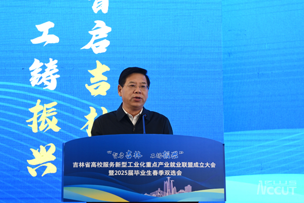 陈权在致辞中首先代表学校向长期以来关心、支持学校事业发展的各级领导和各界朋友表示诚挚感谢,向联盟的成立表示衷心的祝贺!他指出,工业是国民经济的命脉,推进新型工业化是党中央重大战略部署。吉林省作为全国重要工业基地,全面振兴的核心在于工业优势与潜力。高校作为科技、人才与创新的交汇点,应勇担服务新型工业化的使命,在人才培养、技术攻关、产业升级中展现新作为。联盟的成立,正是贯彻习近平总书记关于就业工作重要指示精神的具体实践,也是高校凝聚合力、服务吉林振兴的务实举措。他简要介绍了学校的基本情况并强调,长春工业大学与联盟各校历史渊源深厚,学科特色互补,合作基础坚实。作为发起单位,我校将秉持“团结、服务、创新、开拓”理念,牵头完善联盟机制,深化资源共享,优化就业服务,探索就业新模式。联盟将聚焦吉林新型工业化人才需求,协同推进学科专业动态调整,建立就业信息互通平台,联合开展访企拓岗行动,扩大工业岗位供给,提升人才培养与产业适配度,全力促进毕业生高质量就业。